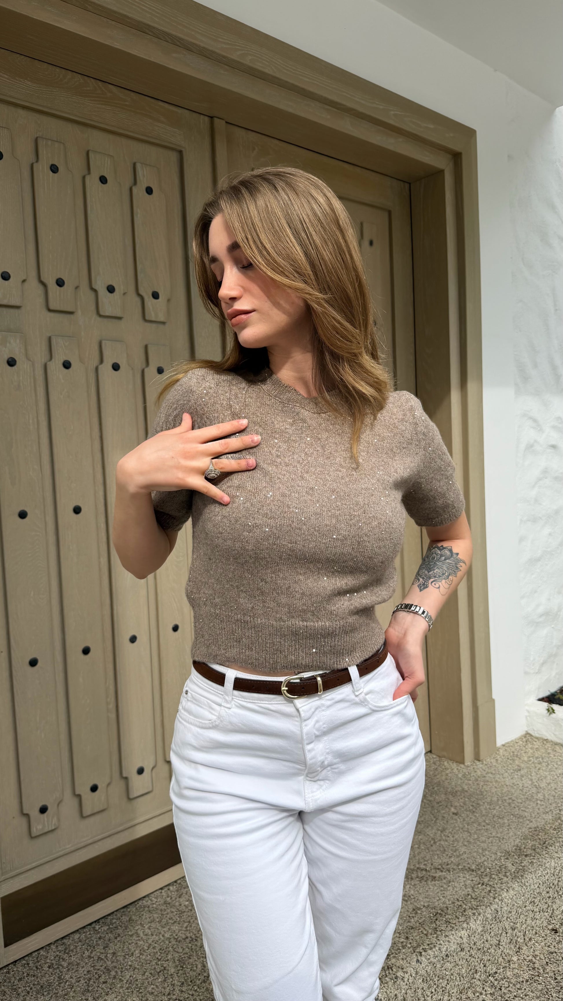 pullu ve simli triko kazak açık vizon rengi